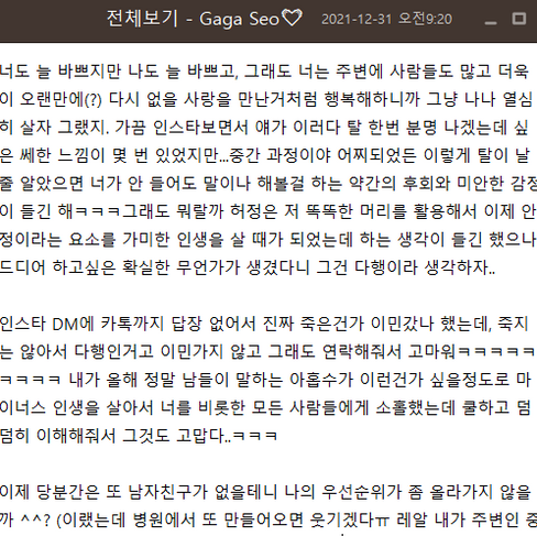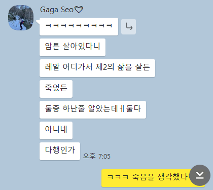 20년차 우정에 빛나는 가연이, 가가. 이놈의 연구실 노예, 내가 두 달 만에 연락 되었는데 내게 처음 한 말좀 봐... ㅋㅋㅋㅋㅋ 진짜 할 말이 없고 너무 웃겨서 빵 터졌다. 이렇게 투박하고 거친 raw함이 이 아이의 매력이자, 우리 관계의 매력이다. 입원해 있는 동안 가연이가 너무 생각났고 보고싶었다. 병문안이 가능했다면 디저트 이따만큼 사 와서 꿍시렁 꿍시렁 계속 뭐라고 했을 거다. 난 분명 알고 있어. 아무튼 말은 저렇게 해도 마음이 따뜻하고 정도 많고 여린 아이.